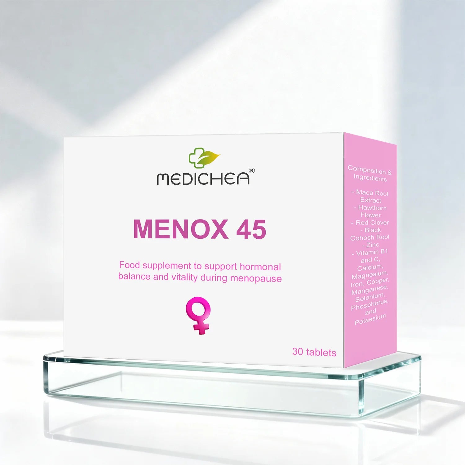 Menox 45 est un complément alimentaire en vente libre pour la période de ménopause ou climatérique. Outre les extraits des sommités fleuries de l'aubépine (crataegus monogyna), de la racine du ver plat de la vigne (cimicifuga racemosa), qui contribue au confort pendant la ménopause, et de l'inflorescence rouge du trèfle des prés (trifolium pratense), un L'un des ingrédients les plus importants de Menox 45 est un extrait hautement concentré des racines de la plante cresson du Pérou (lepidium meyenii), également connue sous le nom de « Maca horská » .